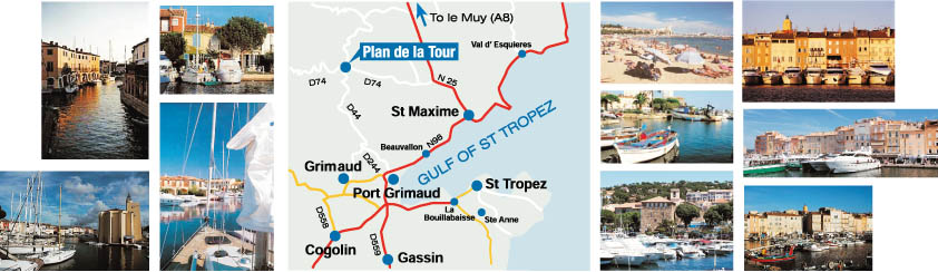 By car exit Autoroute A8 at Le Muy (follow St Tropez signs N25) then take the D74 to Plan De La Tour, all clearly sign posted,